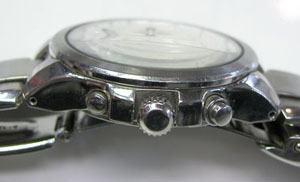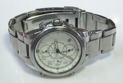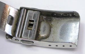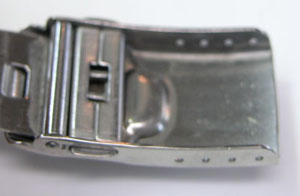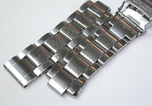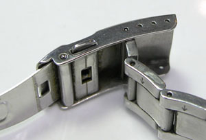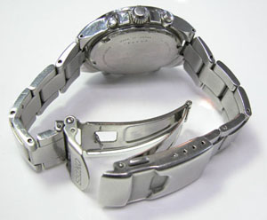 ステンレス無垢バンドに三つ折れプッシュバックルはダブルロック。