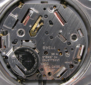 セイコークォーツクロノグラフの汎用ムーブメント。先ずは時刻合わせの竜頭の裏側チェック。