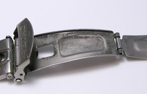 チタン無垢バンドに三つ折れプッシュダブルロックバックル。バックルの微調整部分確認。