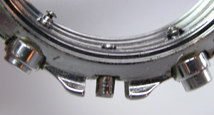 何かといえば目盛リング。これも金属で出来ていました。これは戻すときはキッチリ決まった位置があります。適当に入れますと文字盤を変形させます。プッシュボタンが押さえ込んだままなので修理の依頼です。