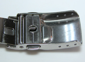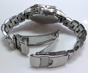 ステンレス半無垢バンドに三つ折れプッシュのダブルロック。裏蓋スクリューバック。