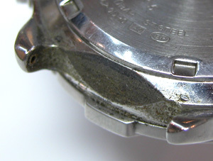 ムーブメントを戻して電池交換。これは汚れではありません。錆びた部分がえぐれて凹んでいる為です。