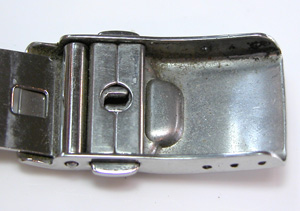 バックルの裏側もチェックします、こういった所は必ず汚れていますから洗浄します。こちらベルトがわ。反対側はバネ棒が錆びていて外れませんからそのまま洗浄します。