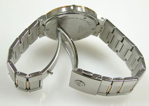 ステンレス無垢バンドに三つ折れプッシュバックル。
