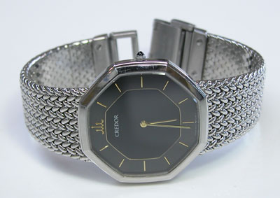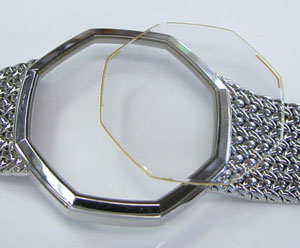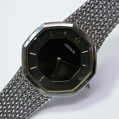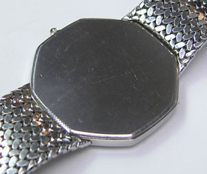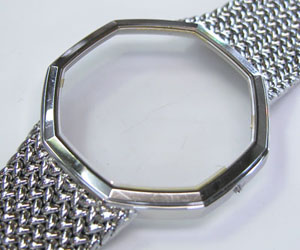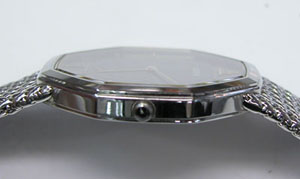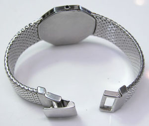 ステンレス無垢メッシュバンドでブレスバックル。ベルト調整は「カット式」ですから大きくするにはベルトとケース交換になりますから高く付きます。