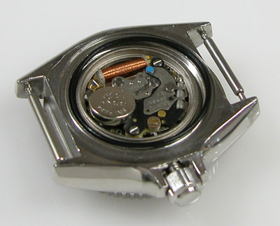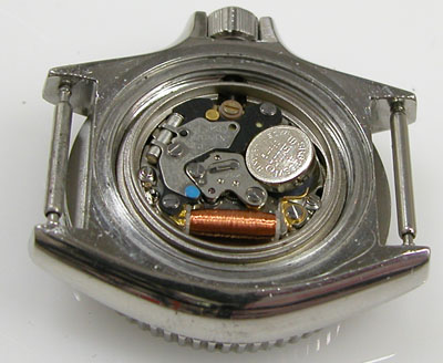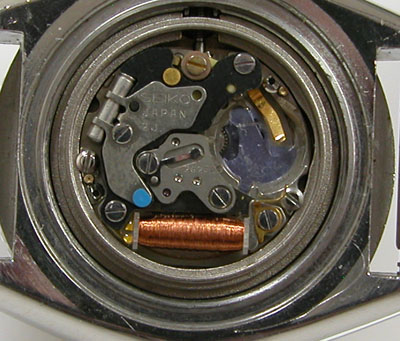 ムーブメント拡大。油っ気がありませんが動くのか?試しに電池を入れて見れば動き出しましたので作業を進めます。