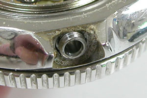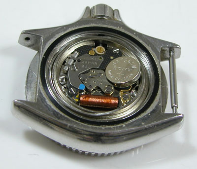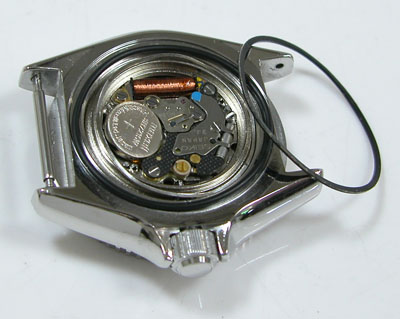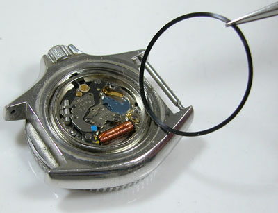 パッキンは交換してシリコン塗布をしてケースに戻します。電池を入れて動作確認ですが秒針がステップではなく引きずる様な動きをします。