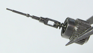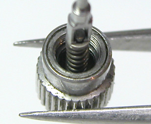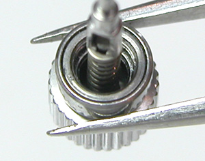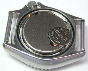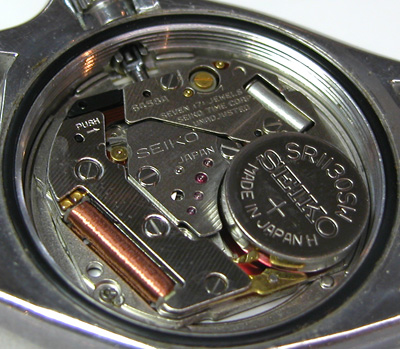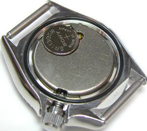 綺麗になったケースにムーブメントをもどして電池格納部をチェックします。次いで新しい電池とパッキンを入れます。