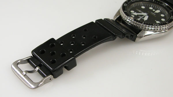 遊び革の状態もチェックします。バンド表面のテカりは加水分解の前兆。