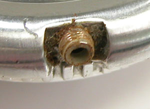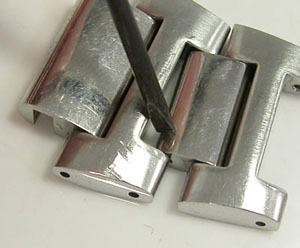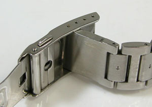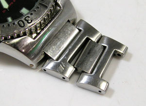 端はやはり割ピンが割れて抜けただけ。ところがその横、これはベルト調整部分では無く修理は不可。「溶接修理」すれば直りますがいくらメタルバンドでもセイコーですから12.000円くらいか?となると溶接修理するよりは専用ブレスの交換。でも12.000円も掛けたくは無いということで。