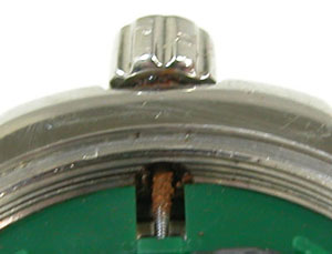 おや?ここまで錆びたら時間を合わせで竜頭を回せば、粉が落ちるでしょう。これ普通に店頭への持込ならスルーして電池交換してお渡しになるでしょう。