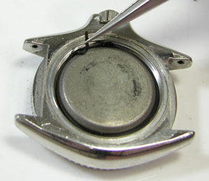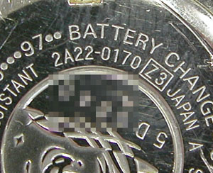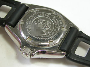 裏蓋記載。 裏蓋の裏側もチェックしますがパッキンが無い?