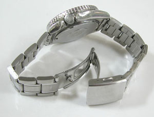 ステンレス板巻きバンドに三つ折れプッシュバックルは既製に交換されております。
