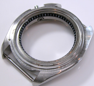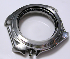 えっ!!このガラスって・・・プラスチック?ダイバーが?さすがに古いダイバーは違いますね。ガラスを外してバフ掛けするしかありません。それも午後に発送なのに。まったく予期していなかった作業ですから大変。全部ばらしていきます。本来この部分は分解して洗浄はしません。よってこの腕時計も結構汚れていましたが、ことの成り行きで綺麗になりました。
