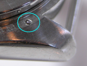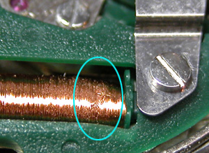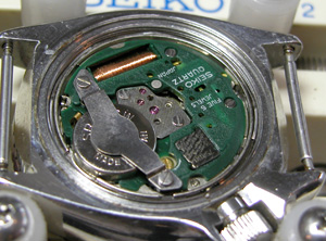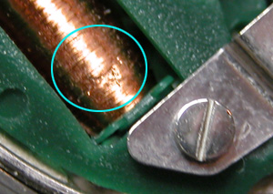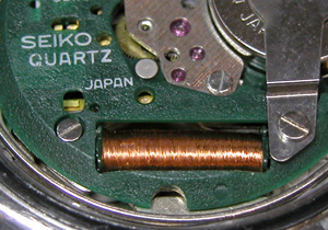これがムーブメント。電池押さえのネジの横。ここにコイルがありますが、明らかにネジを回していてドライバーがかすめた跡です。これ常識的に考えればネジの位置とコイルの位置が違う訳で、何故このネジを触っていてコイルにドライバーが当たるのか?