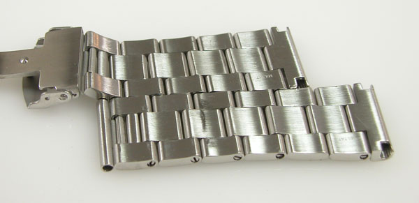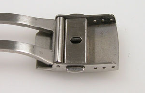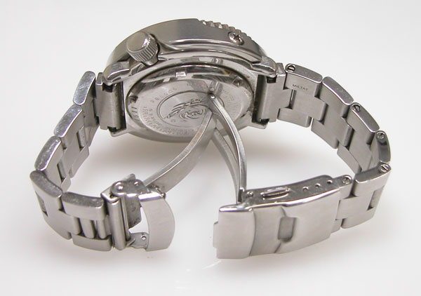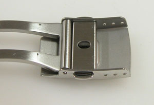 ステンレス無垢バンドに三つ折れダブルロックはプッシュバックル。