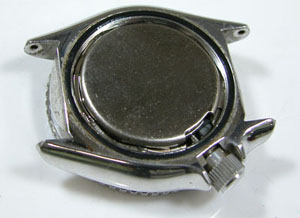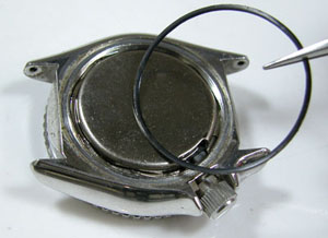 裏蓋を開けると耐磁プレートがムーブメントを覆っています。パッキンを外して汚れを拭き取ります。