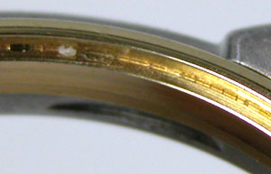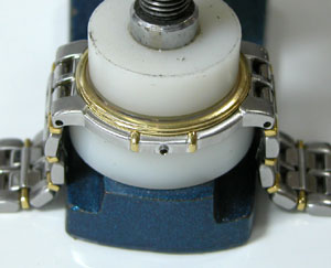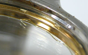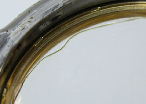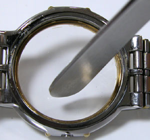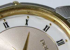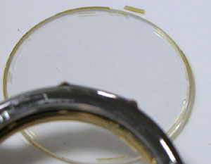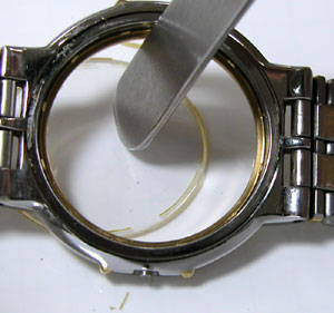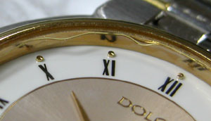 簡単にガラスが外れます。ガラス周辺の接着剤が見事、変色して硬化しています。おそらくこの時計電池交換のみでもう数ヶ月使用すれば、気が付いた時にはガラスは紛失していたでしょう。そうなればドルチェですから当然サファイアガラス。ガラス代9000円は必要になる所でした。