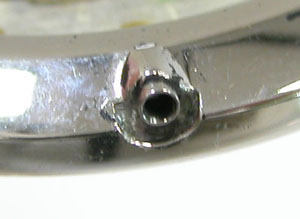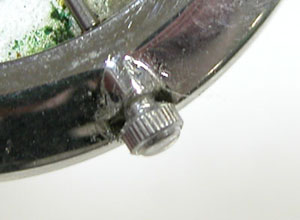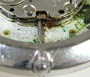 なるほど・・竜頭の根本がサビの塊でビッシリ。これでは竜頭も引き出せない。工具で強引に二段引き位置までは引き出せました。