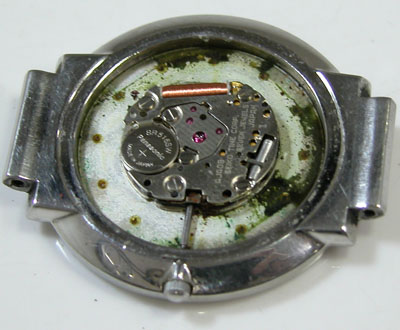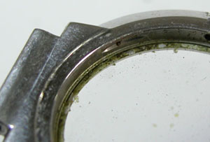 ケースの内側もチェックしますが文字盤と接触あたりがサビで。硝子の内側も目盛リングにもサビが及んでおりますが、これは硝子を外さないと綺麗に出来ないです。ただ外すとパッキンが劣化しているので戻せなくなるでしょう。