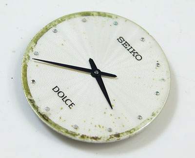 2011年11月16日お預かりのDOLCE 4J40-0A00電池交換メンテナンスです。自分で電池交換はしたが、不動で竜頭が引き出せないと。そして文字盤の汚れも除去のご依頼ですが、文字盤は触るとろくな事にならない。