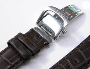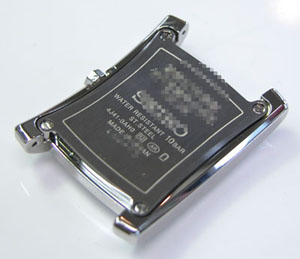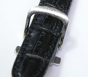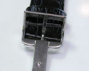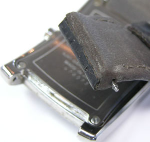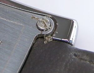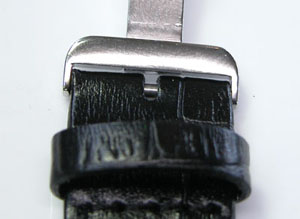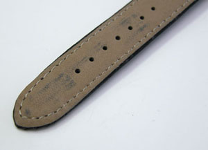 尾錠部はバッチリですが。おや?新品のバンドですが塗料が裏面についています。出荷の歳にバンドを重ねた為に付いたものか?。めったにあり得ない事ですが裏側ですからね。