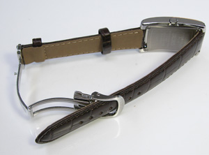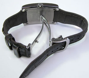 Dバックル革ベルトですが革ベルトと本体が一体風の凝った作りの腕時計。