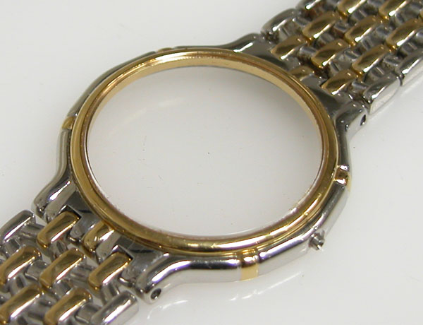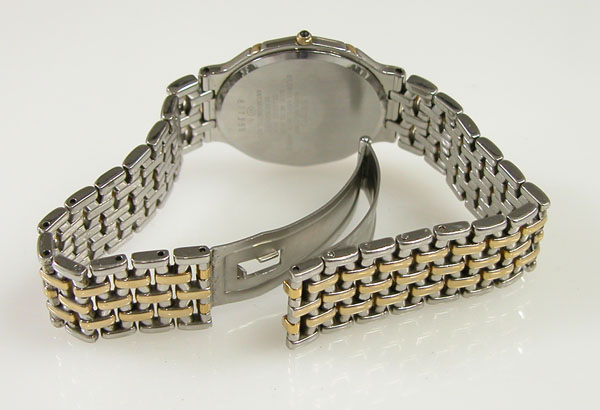 ステンレス無垢バンドに三つ折れバックル。