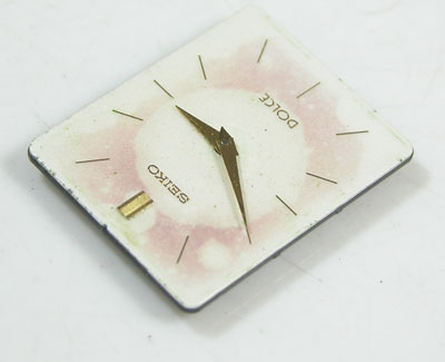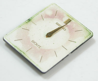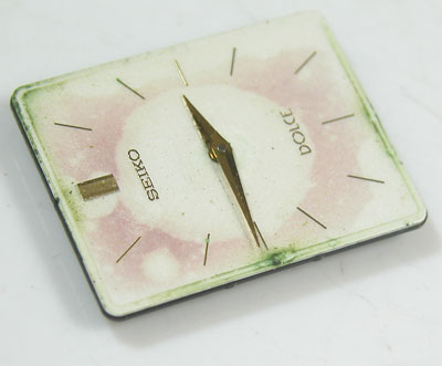 この文字盤のシミは仕方が無いとしても緑色が気になります。