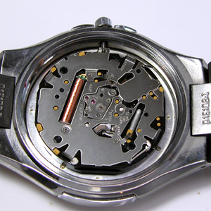 赤い絶縁フィルムがあると言う事は初めての電池交換。これがムーブメント。竜頭が気になります。