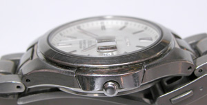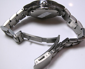 おや?竜頭が歪んでる。この程度は感単に修整は可能でしょうから後で直します。チタン無垢バンドに三つ折れプッシュバックル。