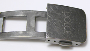 重厚なチタン無垢バックル。チタンにここまでキズが入るとあまり綺麗には出来ないですか。