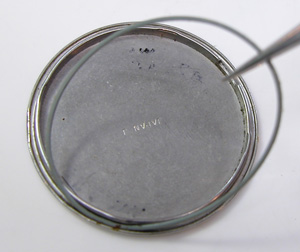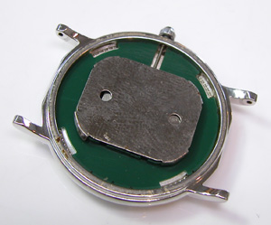 裏蓋を開けると耐磁プレートが見えます。裏蓋のパッキンもチェックして。