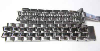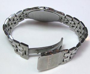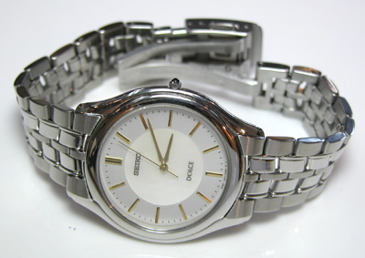 ステンレス無垢バンドに無垢バックル。薄型の腕時計に重厚な無垢バックルは意外な感じがしますが、上手くコーディネートされていますね・・。