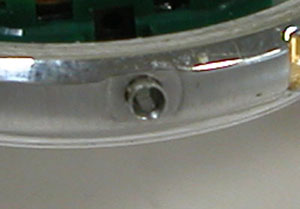 ムーブメント拡大。中央左の「白い点3つ(縦に並んだ)が歯車の軸。つまりプラスチックの歯車ムーブですからOHは無理でしょう。