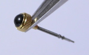 丸いパッキンが平パッキンに近くなっていました。オニキス竜頭が綺麗です。良くこのオニキスのみを紛失した腕時計を見ますが、その場合は竜頭交換で3.000円くらいです。巻芯もかえると5000円近くなります。