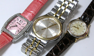 Exceline2J31-0A50エクセリーヌ電池交換メンテナンスです。3本のうちの1本ですが、左のピンクの腕時計はベルト交換の依頼です。