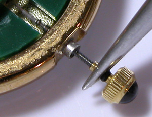 先ずは、竜頭を抜いて。竜頭の裏側をチェックします。ケースの汚れ具合から想像したよりは以外に綺麗ですね。