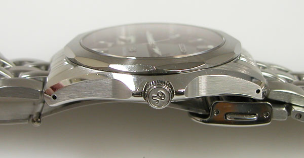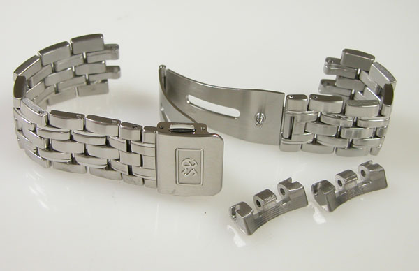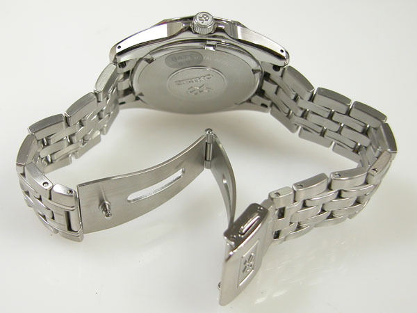 ステンレス無垢バンドに三つ折れプッシュバックル。このコマのデザインまでシーマスそっくりとは。