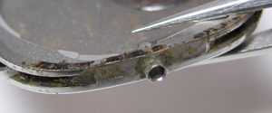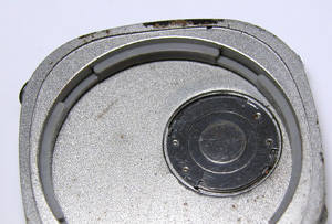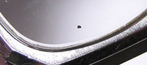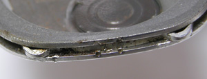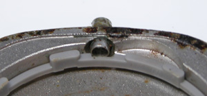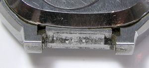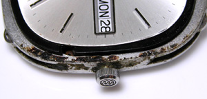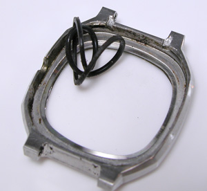 これがケース側、パッキンがみるみる丸くなってしまってもう使い物になりません。ケースの内側、竜頭部チェック。