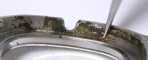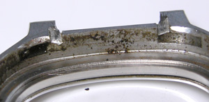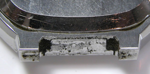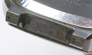 ケースとガラスの隙間も汚れでビッシリ。ケース内側ラグ部側もチェック。