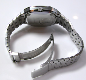 小キズはあるものの綺麗な状態の腕時計。ステンレス無垢バンドに三つ折れバックル。
