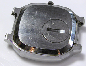 電池蓋のみ開けて電池交換でも動きます。でも、わざわざ大きな裏蓋を開けた為に錆びた粉がムーブメントに落ちて止まる危険性もありますが開ける事に決定!ついでに”多少のキズもOK”の了解を貰って。