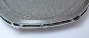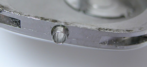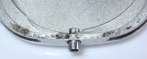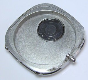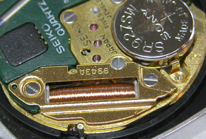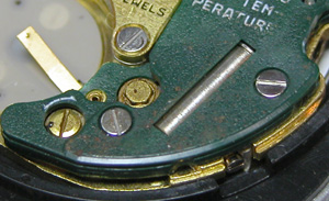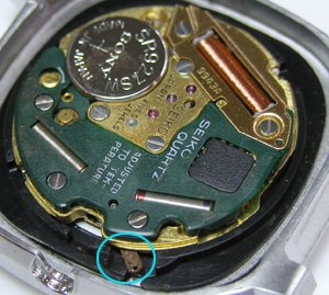 電池格納部をチェックします。その横・・・おや?茶色い粉が。強引に開けましたからショックで内部のサビがムーブメントに掛かったか?