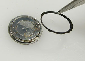 電池フタを裏側から押し出します。パッキンを外して劣化具合をチェックしますが交換するしかないでしょう。
