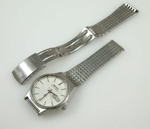 バンドを取り付け電池交換メンテナンス完了です。電池交換後、1時間で止まっておりサイドムーブメント取り出しで注油で動いておりますが「要、分解修理」の状態ではあります。