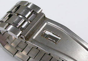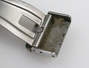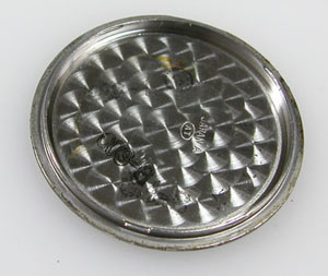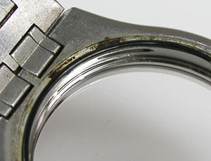 裏蓋を開けると耐磁プレートがムーブメントを覆っています。その耐磁プレートにはシミがありますから内部に湿気が入った痕跡。