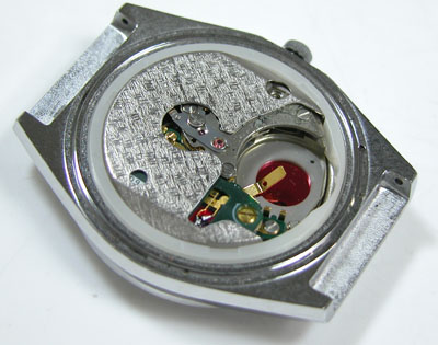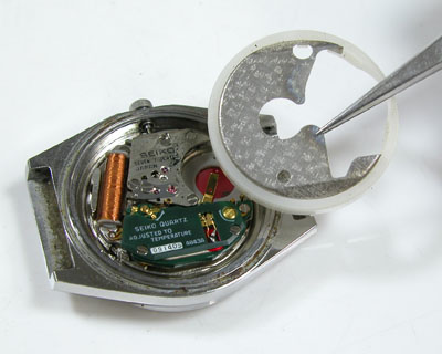 裏蓋を開けると耐磁プレートがムーブメントを覆っています。