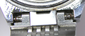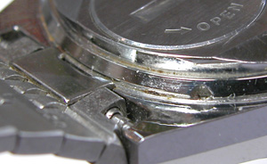 よく見るとバネ棒が錆びているのが見えます。竜頭の裏側チェック。