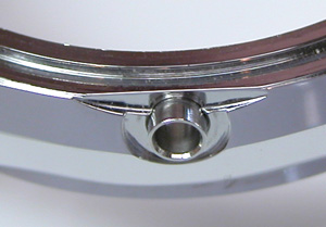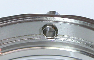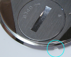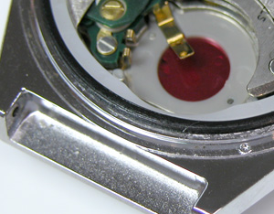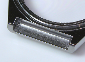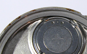 綺麗にサビが落ちましたね。そして写真右側の”・”と。裏蓋の凹みを合わせて裏蓋を閉めます。もちろんプレス器で閉めますがコマを回転させない様に閉めないとこの位置がずれます。